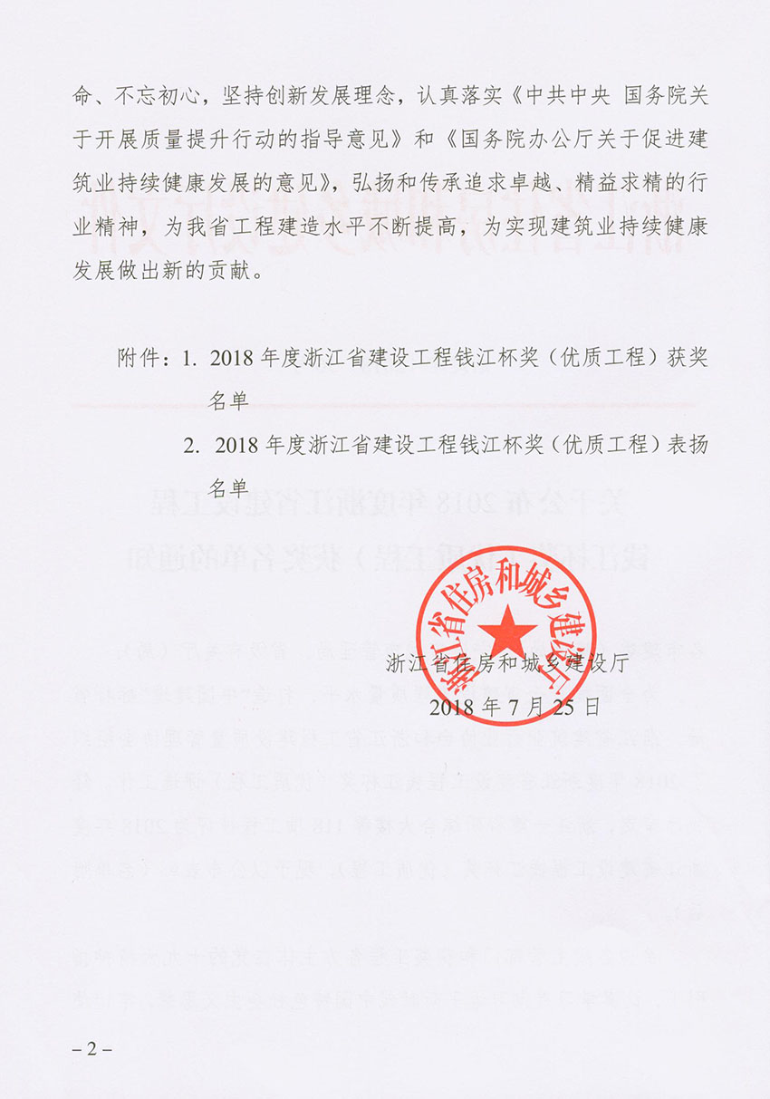 喜報!近日,省建設(shè)廳頒發(fā)了2018年度浙江省建設(shè)工程“錢江杯”(優(yōu)質(zhì)工程)文件,我公司“麗水市體育館體育中心工程、松陽縣供電局電力調(diào)度生產(chǎn)綜合用房工程”分別獲得2018年度“錢江杯”(優(yōu)質(zhì)工程)獎。